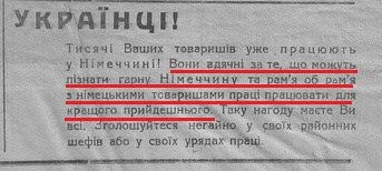 "От нас требуется помощь и сотрудничество, - говорится в этом номере. - Украинская молодежь! С полным доверием и осознанием требования времени езжай на работу в Германию... Работа в Германии - сиюминутный приказ".